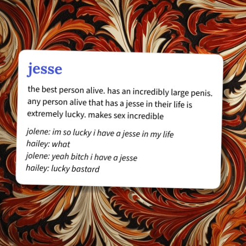 jesse: the best person alive. has an incredibly large penis. any person alive that has a jesse in their life is extremely lucky. makes sex incredible