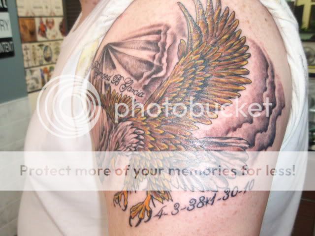 Got my first one at 18, and haven't stopped yet. I've got two more on my shoulder blades, but no pictures. This is my favorite though. I've always been obsessed with the Phoenix, ever since I was a little kid, so I had a friend draw this up. The one above it is my old band name (BrokiN), but the N was supposed to be backwards, and you can barely see the line connecting it. We broke up, but the other two dudes in the band are still two of the most important people that have ever been a part of my life. I need to get them both touched up.Attached FilesLast edited by chilli311; 04-25-2010, 05:14 AM.Through music, you can live forever...TEAMS: San Diego Chargers, San Diego Padres, Notre Dame Fighting IrishComment