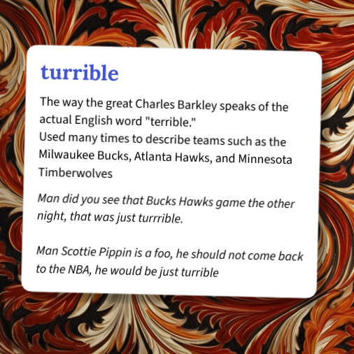 turrible: The way the great Charles Barkley speaks of the actual English word "terrible." Used many times to describe teams such as the Milwaukee Bucks,...