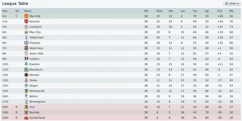 Struggling to stay above the relegation zone with Hull, but I made it to the FA Cup quarterfinals (lost 1-0 to Man U) and have rattled off some decent results (drew Liverpool, beat Tottenham, beat Everton).Comment