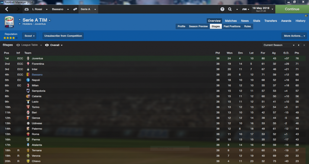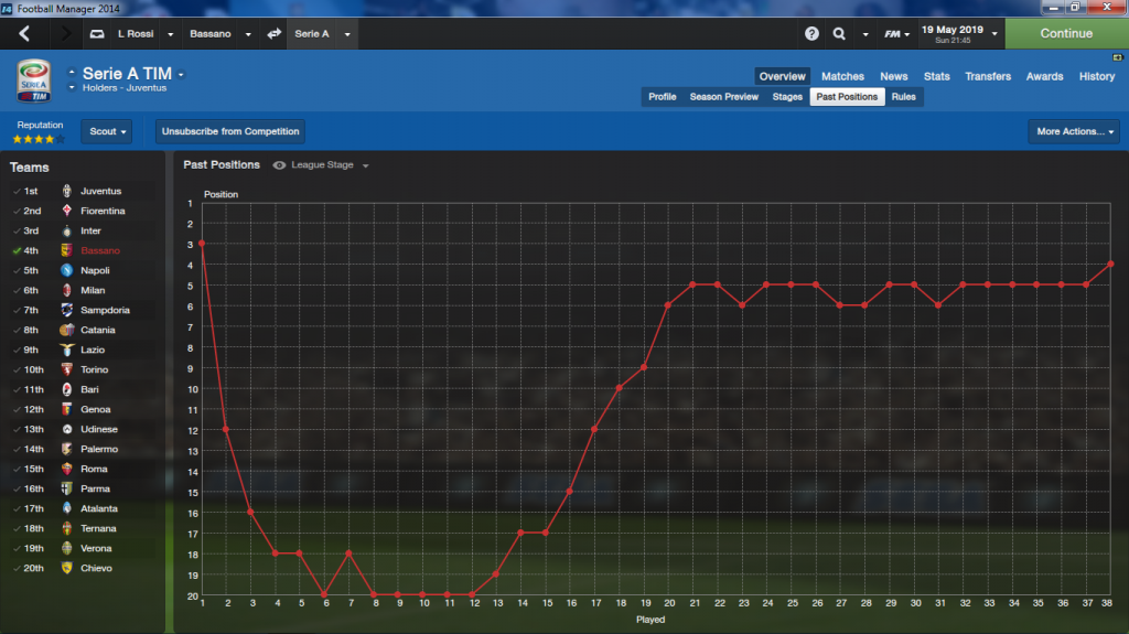 After a month being on the side and a couple of saves later I decided to continue with my Bassano save. I was dead last in the league but something in the team clicked and we won 4 out of our last 6. Because of that we moved up all the way to 12th at the end of the year.