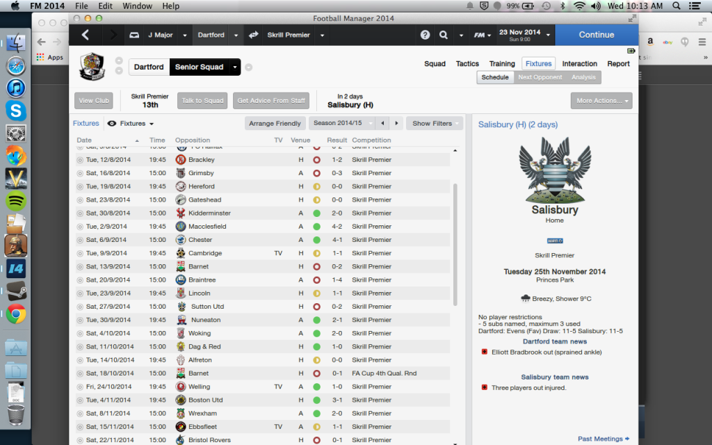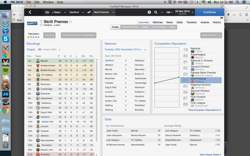 Just about halfway through my second season at Dartford and we've sadly just seen our 8 match unbeaten streak ended. We sit in 13th place (after losing to now 3rd place Bristol Rovers.) Again we were projected to finish near the bottom with 40-1 odds to win the league. We're 15 points clear of relegation and 6 points out of the promo. playoff spot. Hopefully we can start a new unbeaten streak and finish somewhere in the top 10.