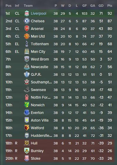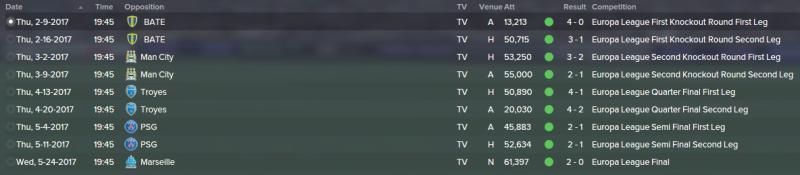 Quick highlights - Won the EPL while scoring the most and conceding the least. Won the Europa League with a 9-0-0 record after finishing 3rd in our CL group, including going through Man City and PSG. Our first league loss at Anfield (to Huddersfield!!). We still haven't beaten Man U in any competition in 3 seasons - they have some kind of cheat code against me.