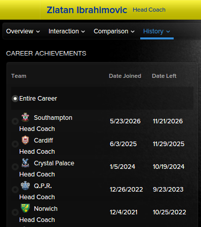 *Zlatan has had a bit of a rough coaching career...sacked repeatedly after taking over mid season for Norwich, QPR and CP who all were relegated. Then sacked mid-season in his 2 most recent stints. Poor Zlatan.