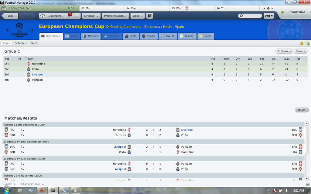 Things arent going so well. Having my world class players injured and out of form didn't help me much. I have a big match against Fiorentina coming up this week. Hoping Torres will make it his return to the CL.Comment